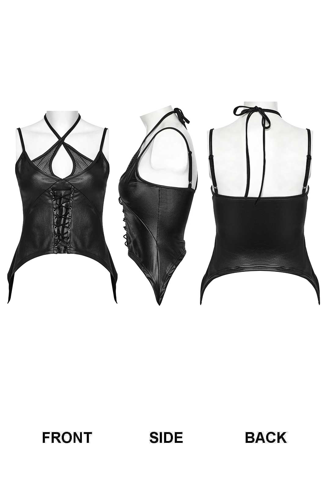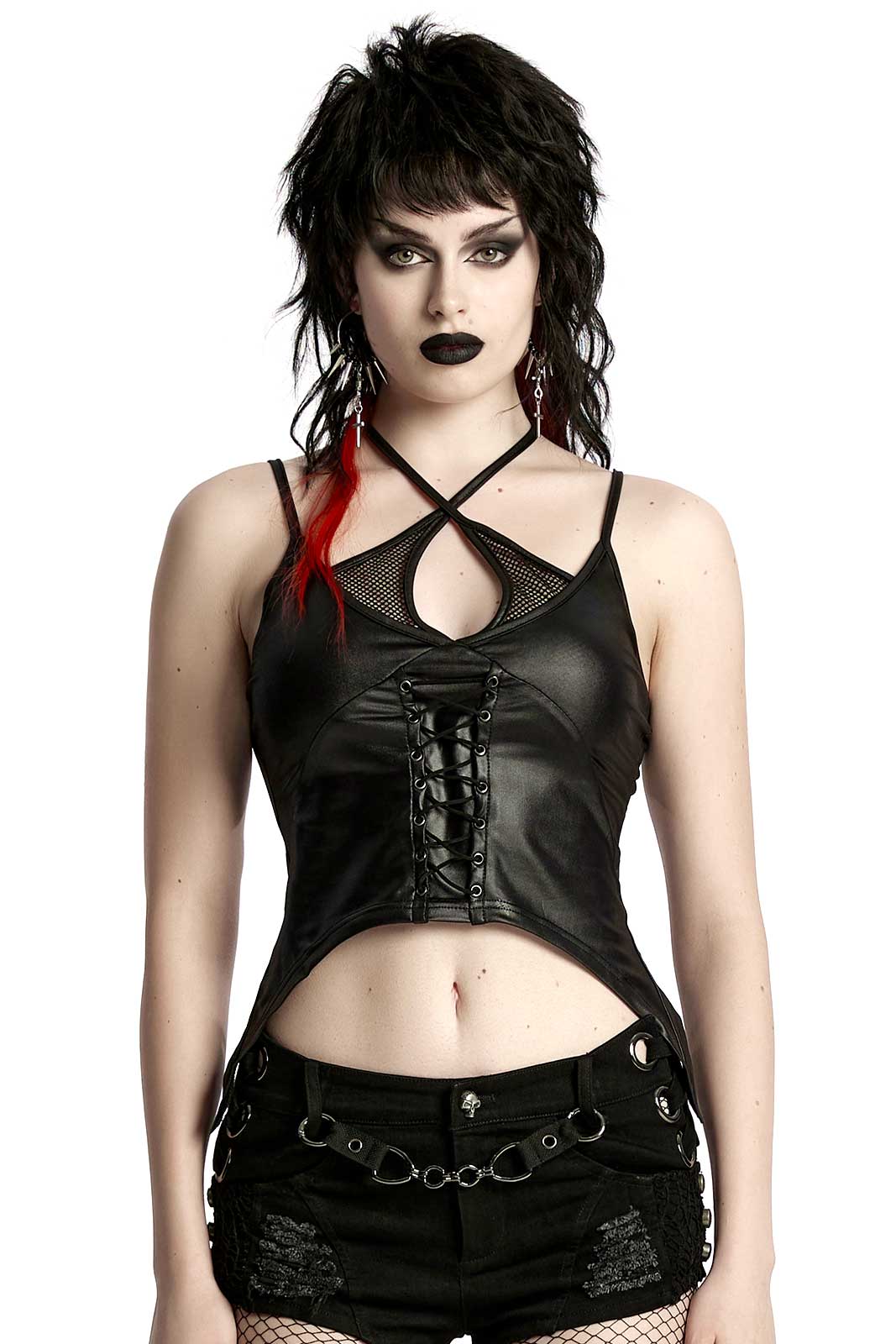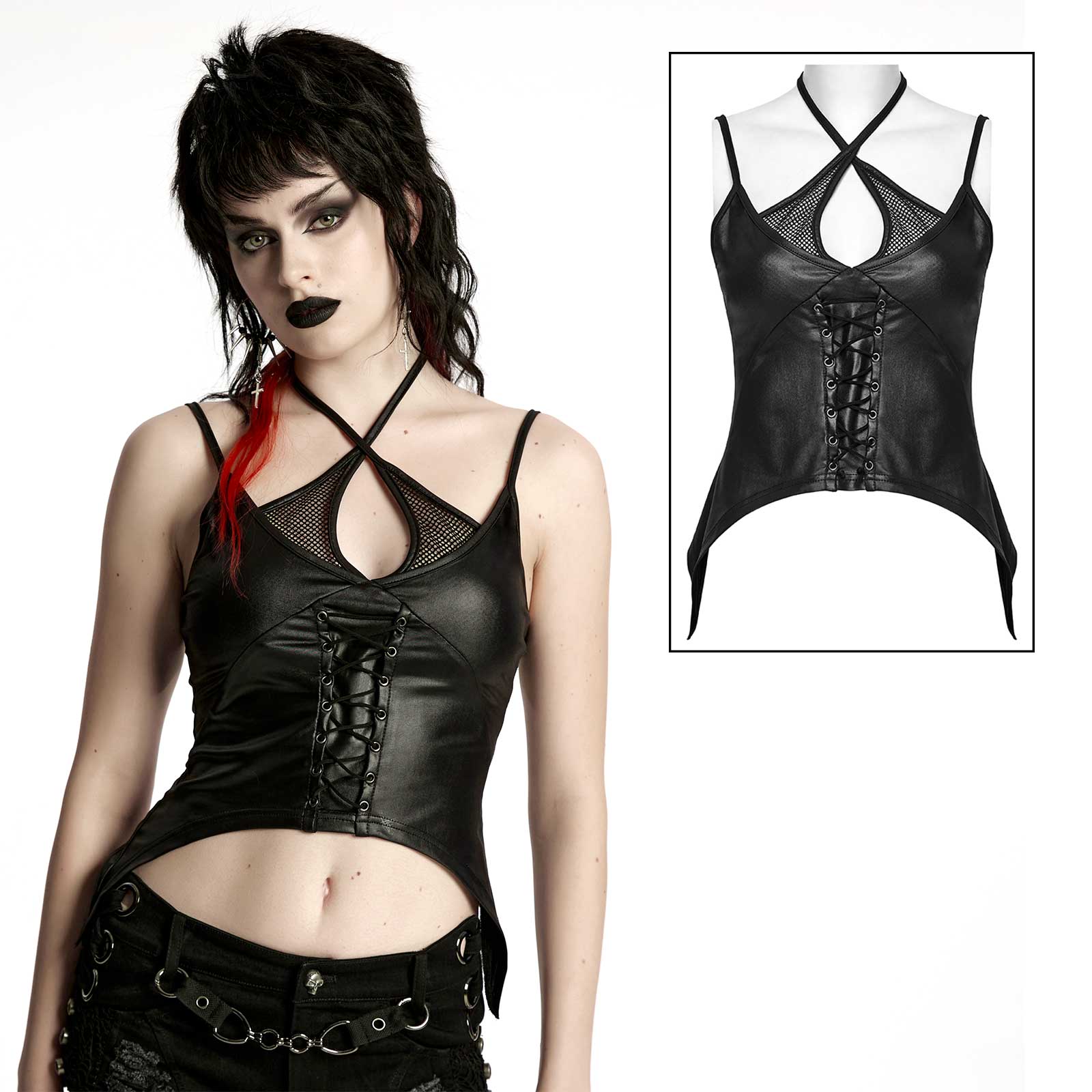 Punkiges Hemdchen im Leder-Look von Punk Rave. Stretchiger Wetlook-Stoff. Dünne, verstellbare Spaghetti-Träger. Statement-Detail im Dekolleté aus Fishnet mit Neckholder-Bändchen. Zierschnürung vorn. Kurzer Schnitt; lange, zipfelartige Seiten.