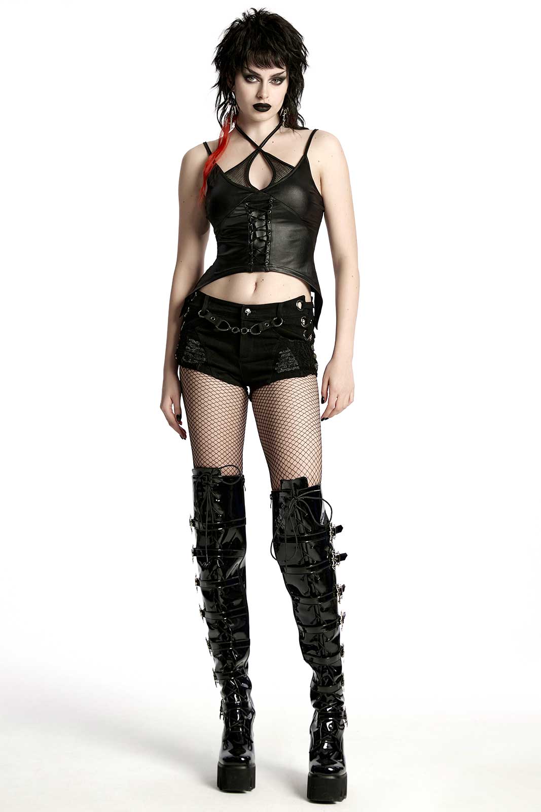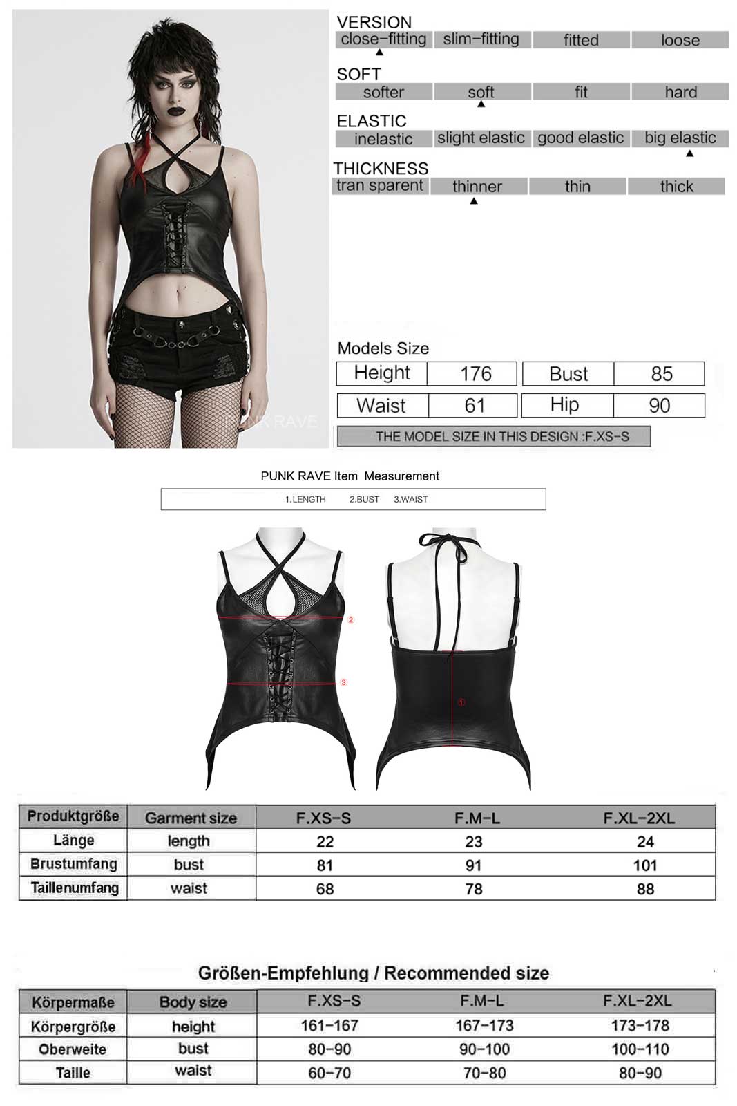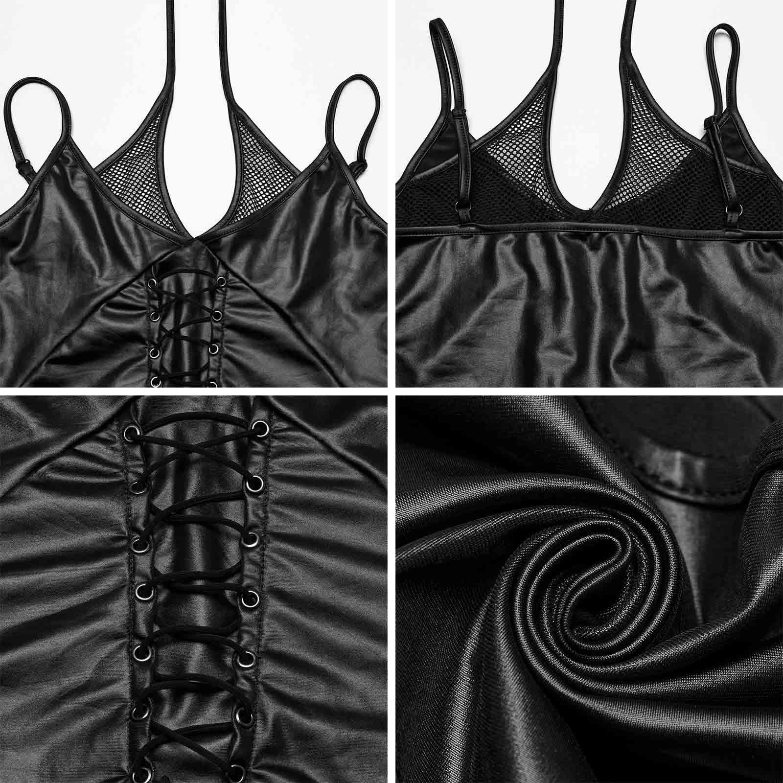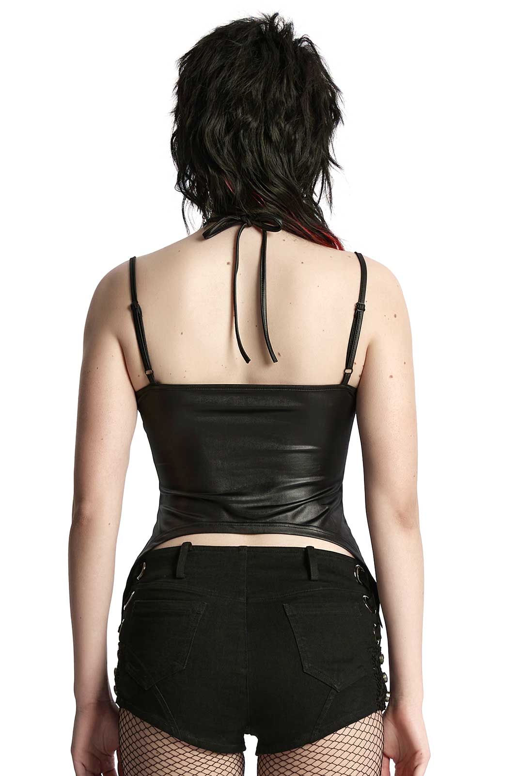 Punkiges Hemdchen im Leder-Look von Punk Rave. Stretchiger Wetlook-Stoff. Dünne, verstellbare Spaghetti-Träger. Statement-Detail im Dekolleté aus Fishnet mit Neckholder-Bändchen. Zierschnürung vorn. Kurzer Schnitt; lange, zipfelartige Seiten.